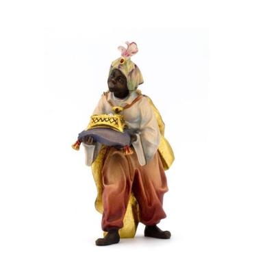 Der anmutige Page trägt einen Turban mit einer großen Feder auf dem Kopf und ein edles, orientalisches Gewand. In den Händen hält er bedächtig ein verziertes Kissen, auf das er sein kostbares Geschenk für das Jesuskind gebettet hat.