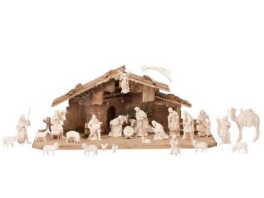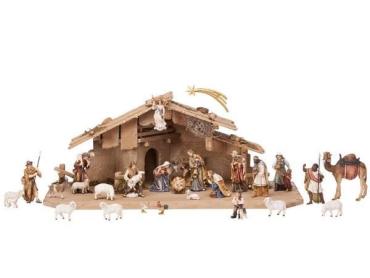 Dieses 29 teilige Krippenset besteht aus folgenden Figuren und Krippenstall Hl.Nacht Gloriaengel und Kometstern Hl.Familie 4 teilig Ochs und Esel 3 Könige 6 Schafe 1 Lamm 3 Hirten, 1 Hirtin mit Kind, Hirtenbub 1Kamel mit Treiber Henne, Hahn, Ziege