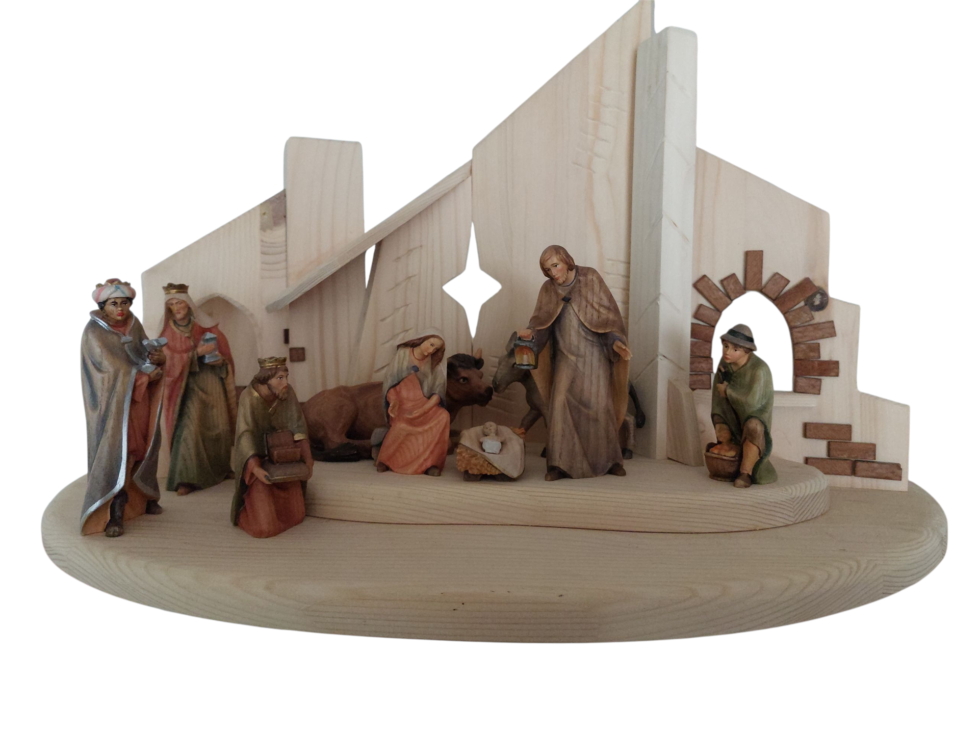 Die Krippenfiguren aus feinstem Eschenholz sind 12 Zentimeter groß und wurden sorgfältig mit Wasserfarben bemalt, sodass jede Figur lebendig und einzigartig wirkt. Der moderne Stall aus Fichtenholz ergänzt das Ensemble perfekt und verleiht Deiner Weihnachtskrippe eine zeitgemäße Eleganz, die sich harmonisch in Dein festliches Ambiente einfügt. Die Kombination aus hochwertiger Handwerkskunst und stilvollem Design macht dieses Set zu einem echten Blickfang.