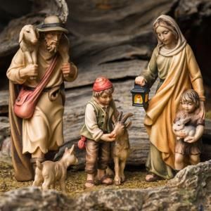 Die Krippenfigur zeigt eine Hirtin, die liebevoll einen Jungen begleitet. Die Hirtin trägt ein einfaches Gewand mit Umhang und Kopftuch. In der rechten Hand hält sie eine Laterne, deren sanftes Licht den Weg erhellt. An ihrer Seite steht ein Junge, der eng an sie geschmiegt ist. Er trägt schlichte Kleidung und hält behutsam einen kleinen Hasen im Arm, den er zärtlich an sich drückt.