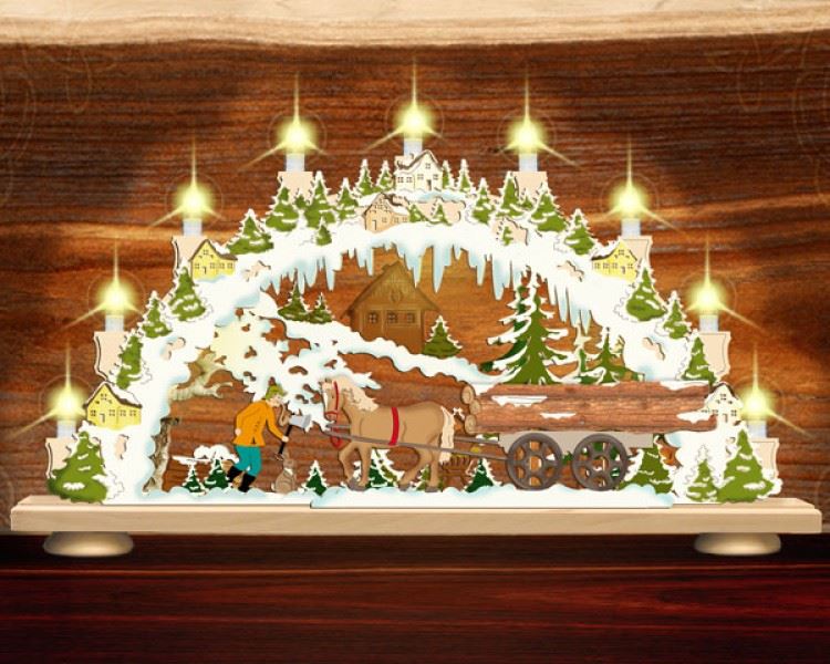 Der Pferdekarren, der Waldarbeiter, sowie eine Bäumchenreihe wurden im Versatz angeordnet.