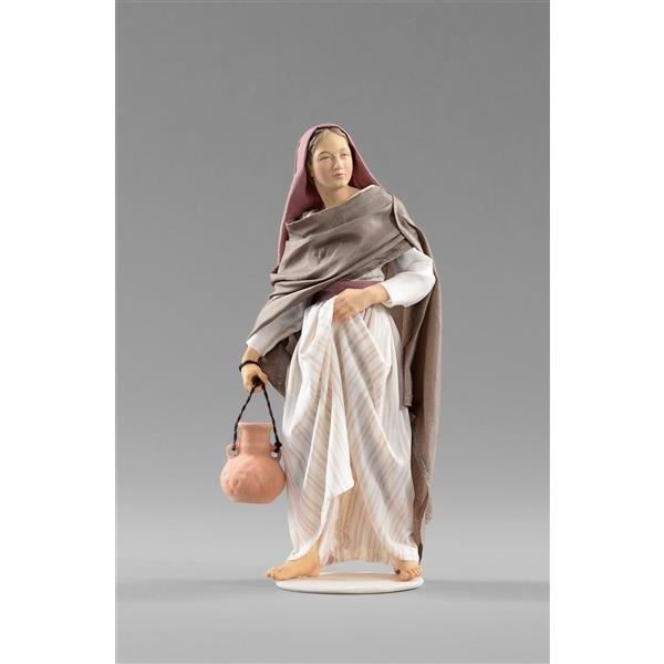 Die schöne Wasserträgerin trägt einen fließenden Umhang und ein langes Kopftuch zu ihrem Kleid. Mit der linken Hand hebt sie ihren langen, schön fallenden Rock leicht an. In der rechten Hand hält die junge Frau einen großen Tonkrug.
