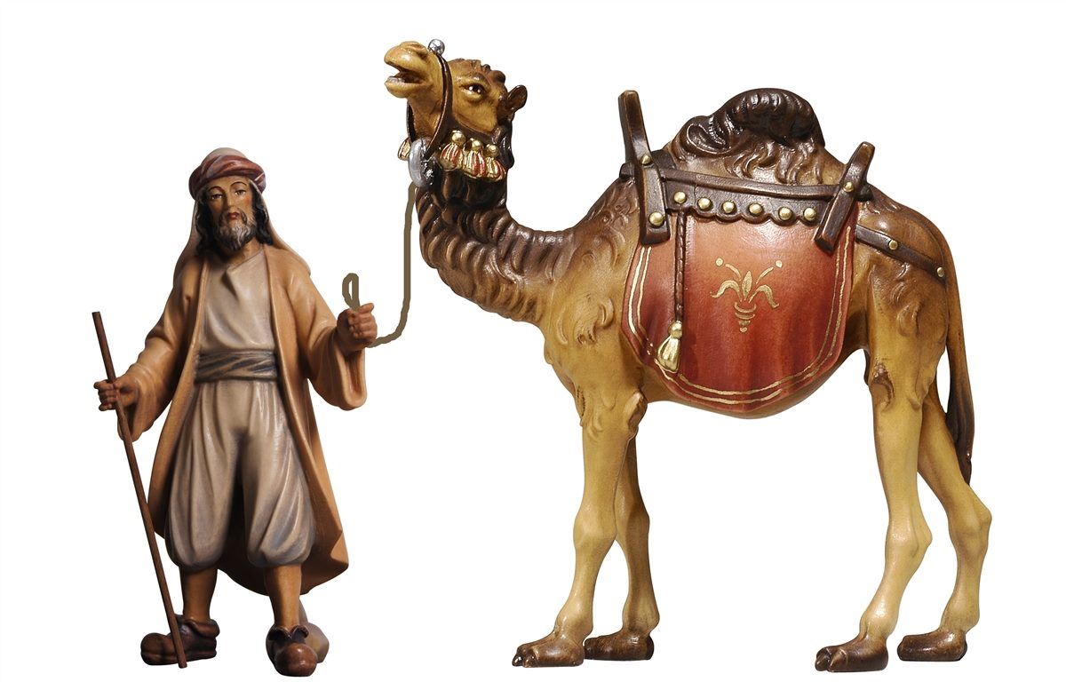 Der Treiber trägt eine weite Balonhose, einen langen Mantel und auf dem Kopf einen kunstvoll gebundenen Turban. In seiner rechten Hand hält er einen Stab, in der linken das Führseil des Kamels. Sein längerer Bart und die fein ausgearbeiteten Gesichtszüge verleihen der Figur Ausdruck und Würde. Das Kamel steht ruhig und majestätisch an seiner Seite – ein echtes Highlight jeder orientalischen Krippenszene.