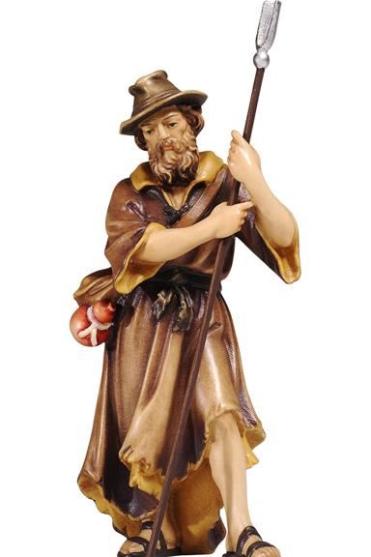Die Krippenfigur Schäfer der Kostner Krippe in einfacher Kleidung eines Schafhirten mit Hut stützt sich an seinem Stock und betrachtet versonnen seinen vor ihm liegenden Hirten.Er hat einen kleinen Wasserbeutel umhängend und trägt einen kräftigen Bart. Der Hirte ist als Schafhirte zur Gestaltung einer großen Schafweide erfoderlich. Die Abbildung zeigt die colorierte Ausführung des in Ahornholz geschnitzen Krippenfigur. Die Figur ist lagernd oder kurzfristig lieferbar.