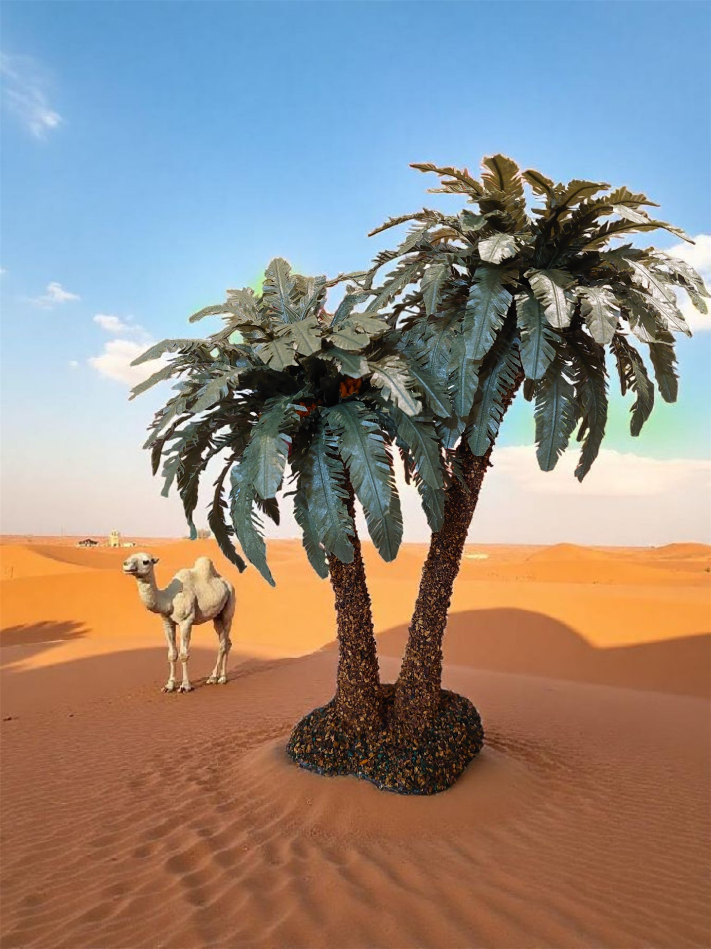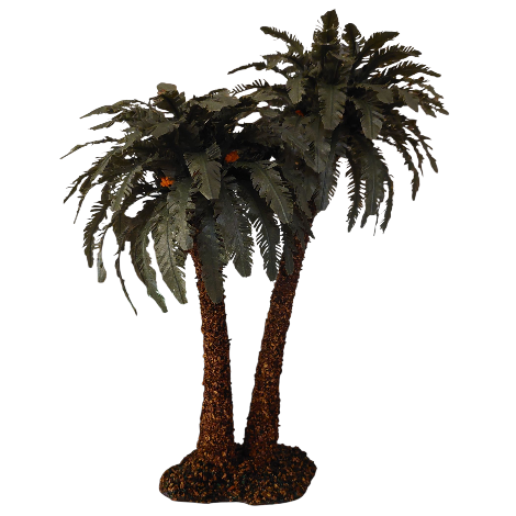 Die Dattelpalme gehört zu den ältesten in Palästina verbreiteten Obstbäumen.Stamm und Bodenplatte der Palme sind aus stabilen Kunststoff gefertigt, beflockt mit Kork. Palmzweige aus Spezialkunststoff mit Draht zum Formen der Wedel. Biblisch gehört die Palme zu den 7 Früchten des Kulturlandes und ist typisch für Palästina. Faktisch konnte man alle Teile der Dattel verwenden: Die Stämme lieferten Bauholz für Dächer und Zäune sowie Brennholz. Aus den Blättern stellte man Matten und Körbe her. Daneben dienten sie auch als Viehfutter. Die Endknospen verarbeitete man als Palmkohl. Die Dattelfrüchte wurden frisch, und getrocknet gegessen und zu Sirup gepresst (Dattelhonig).