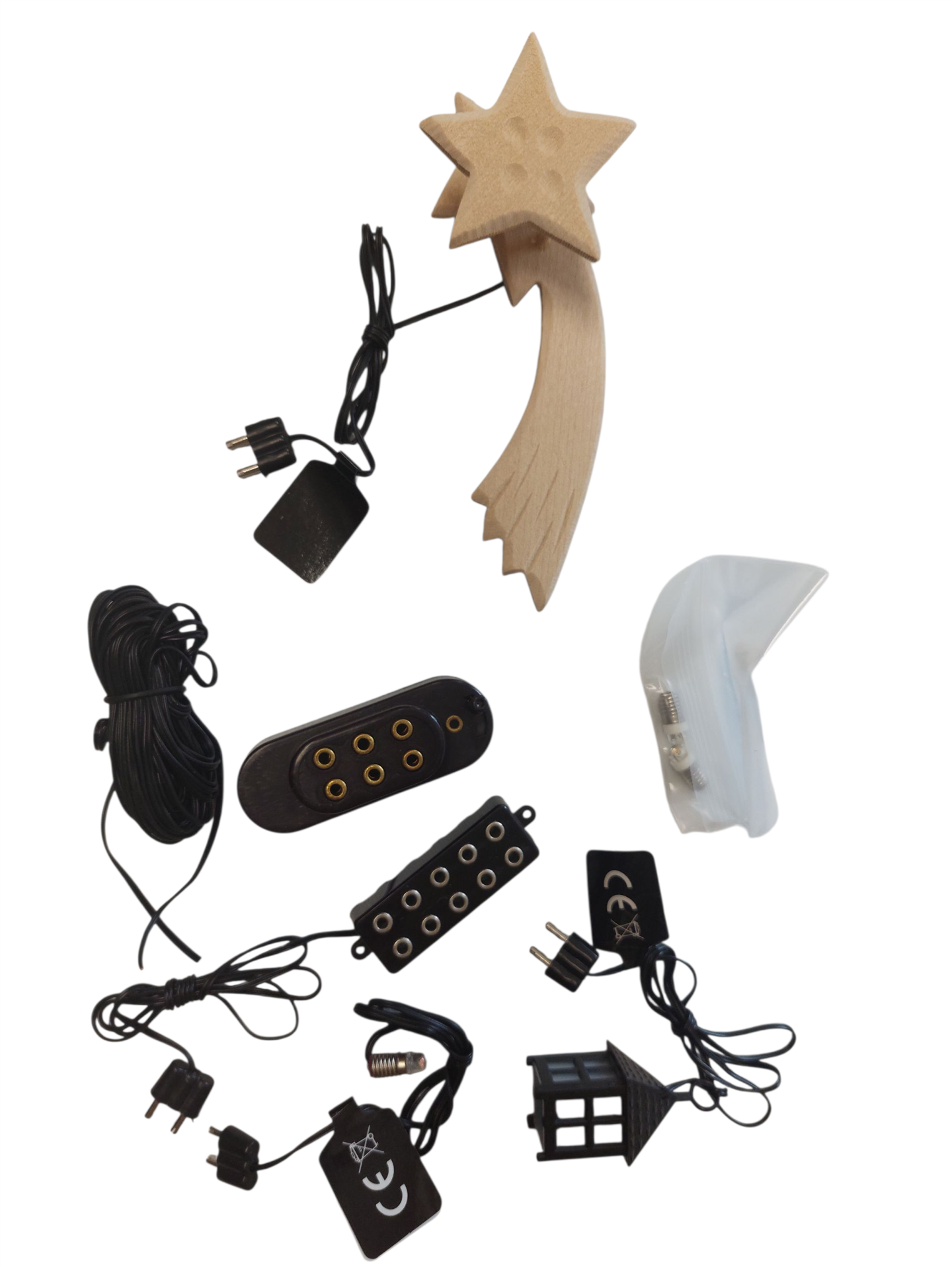 Unser liebevoll zusammengestelltes Zubehörset Elektrik bietet Ihnen alles, was Sie für eine stimmungsvolle Beleuchtung Ihrer Weihnachtskrippe benötigen. Die 5 Meter lange Zuleitung sorgt für flexible Platzierung, während der handgefertigte Kometstern aus Holz als besonderer Blickfang erstrahlt. Zwei LED-Birnchen sowie ein weiteres LED-Birnchen mit Kabel, Stecker und Fassung garantieren ein warmes, realistisches Licht, das Ihre Krippenszene lebendig wirken lässt. Ergänzt wird das Set durch eine traditionelle Laterne, einen praktischen 5-fach-Verteiler und eine Batteriekappe für 4,5-Volt-Batterien – so schaffen Sie mit diesem echten Krippenzubehör eine festliche Atmosphäre voller Detailverliebtheit und Handwerkskunst.