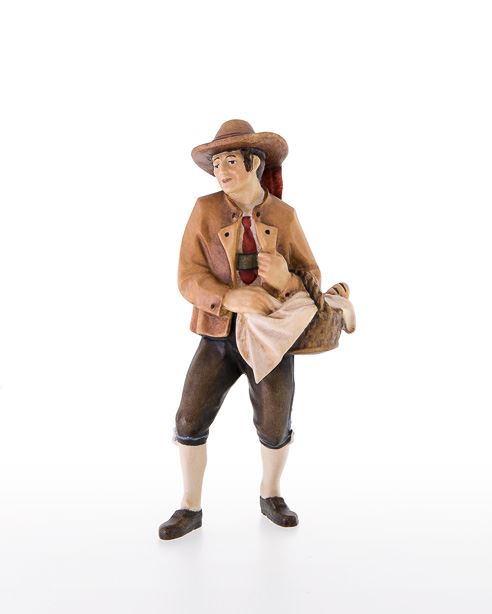 Hirt mit Brotkorb der Alpenländischen Krippe von Lepi. Diese Figuren werden nur in 12 cm Größe geschnitzt.