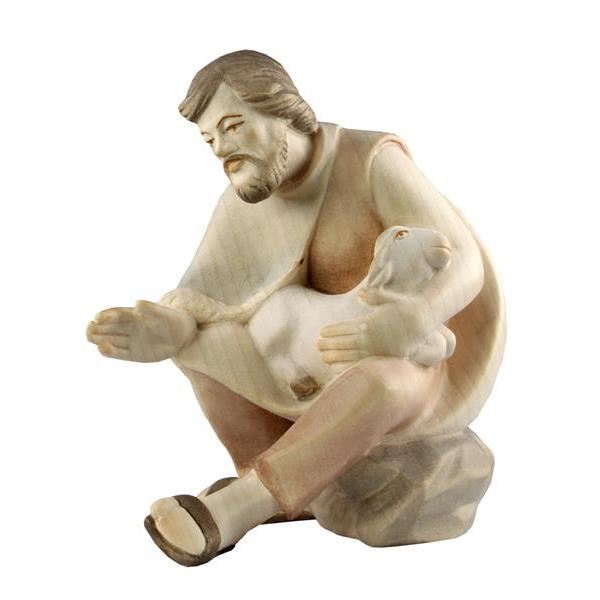 Der sitzende Hirte ruht auf einem Stein, im Arm trägt er ein sanftes Lamm – eine Szene voller Ruhe, Demut und Fürsorge. Seine Gestalt wirkt beschützerisch, zugleich zeigt sich seine Nähe zur Natur und zu den Tieren. Er könnte Teil einer Hirtenszene beim Feuer sein oder einfach die Ruhepause nach der Arbeit darstellen.