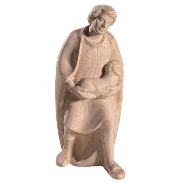 Hirte mit Lamm der Rowi Krippe in Eschenholz geschnitzt. Diese Figur ist von exquisiter Machart. Sie wirkt schlicht und von der Holzart lebendig und weist aber dennoch viele detailfreudig ausgearbeitete Einzelheiten auf.