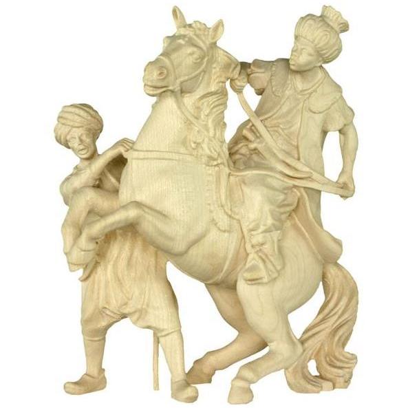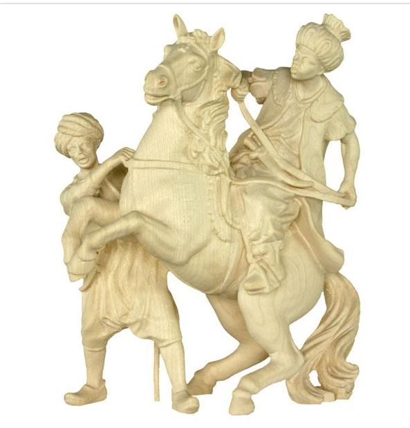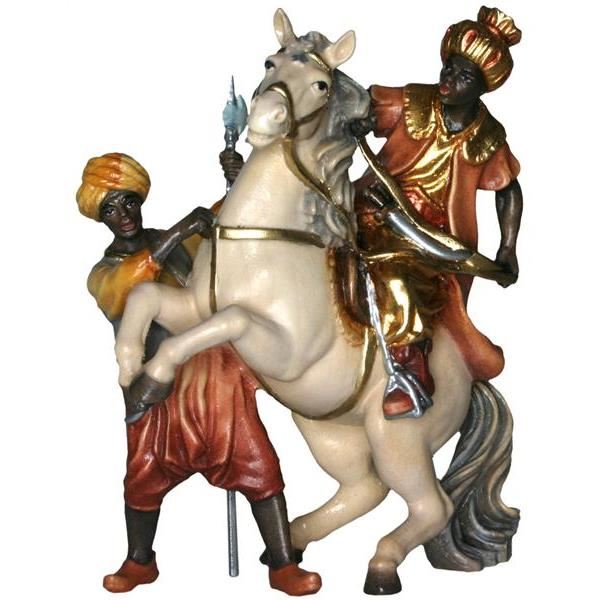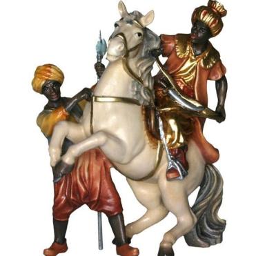Die Orientalische Krippenfigur König auf Pferd der Armo Krippe wurde aus Bergahorn geschnitzt und in der Oberflächenausführung Color mit Ölfarben handbemalt.