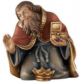 Der kniende König hat seine Krone abgelegt, um das neugeborene Jesuskind anzubeten. Der kniende König hat einen stattlichen Bart und trägt kostbare Kleidung. Er hält eine geöffnete Truhe Gold in den Händen, die er dem Kind überreichen möchte. Die Demut des reichen Mannes ist eine der ergreifendsten Szenen der Bethlehem Krippe