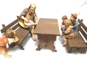 Sehr schönes Krippenset bestehend aus alter Mann erzählend ,Junge zuhörend , Kindergruppe essend und 2 Bänken und einen Tisch im Tiroler Bauernstil