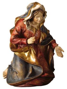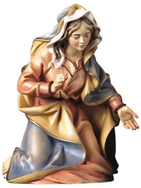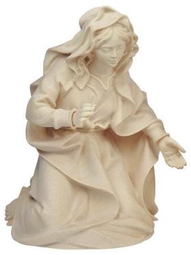 Die Heilige Maria wird als Teil der Original Ulrich Krippe in einer knienden Haltung dargestellt. Die anmutige Frau faltet die Hände und blickt voller Dankbarkeit und Gottvertrauen auf ihren neugeborenen Sohn. Unter ihrem Tuch blickt ihr gelocktes Haar heraus, welches die zarten Gesichtszüge der Heiligen Mutter sanft betont. Die Krippenfigur wurde aus Bergahorn geschnitzt und in der abgebildeten Ausführung color mit Ölfarben handbemalt. Die Figur ist lagernd.