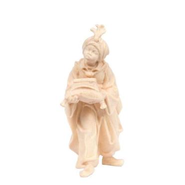 Der anmutige Page trägt einen Turban mit einer großen Feder auf dem Kopf und ein edles, orientalisches Gewand. In den Händen hält er bedächtig ein verziertes Kissen, auf das er sein kostbares Geschenk für das Jesuskind gebettet hat.