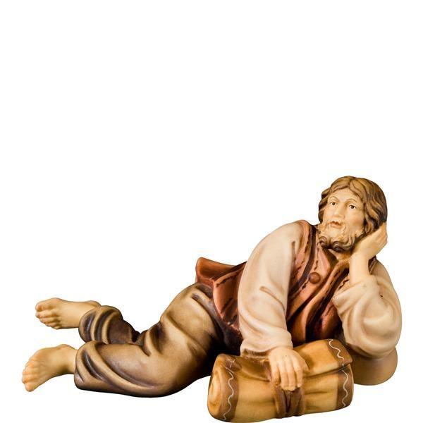 "Hirt liegend" - Der Hirt ruht entspannt auf der Seite. Die linke Hand liegt unter seinem Kopf, leicht angewinkelt, um ihn zu stützen und zu erhöhen. In der rechten Hand hält er eine zusammengerollte Decke, die locker auf dem Boden aufliegt. Seine Haltung vermittelt Ruhe und Geborgenheit, passend zur friedlichen Krippenszene.