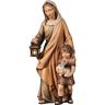 Die Krippenfigur zeigt eine Hirtin, die liebevoll einen Jungen begleitet. Die Hirtin trägt ein einfaches Gewand mit Umhang und Kopftuch. In der rechten Hand hält sie eine Laterne, deren sanftes Licht den Weg erhellt. An ihrer Seite steht ein Junge, der eng an sie geschmiegt ist. Er trägt schlichte Kleidung und hält behutsam einen kleinen Hasen im Arm, den er zärtlich an sich drückt.