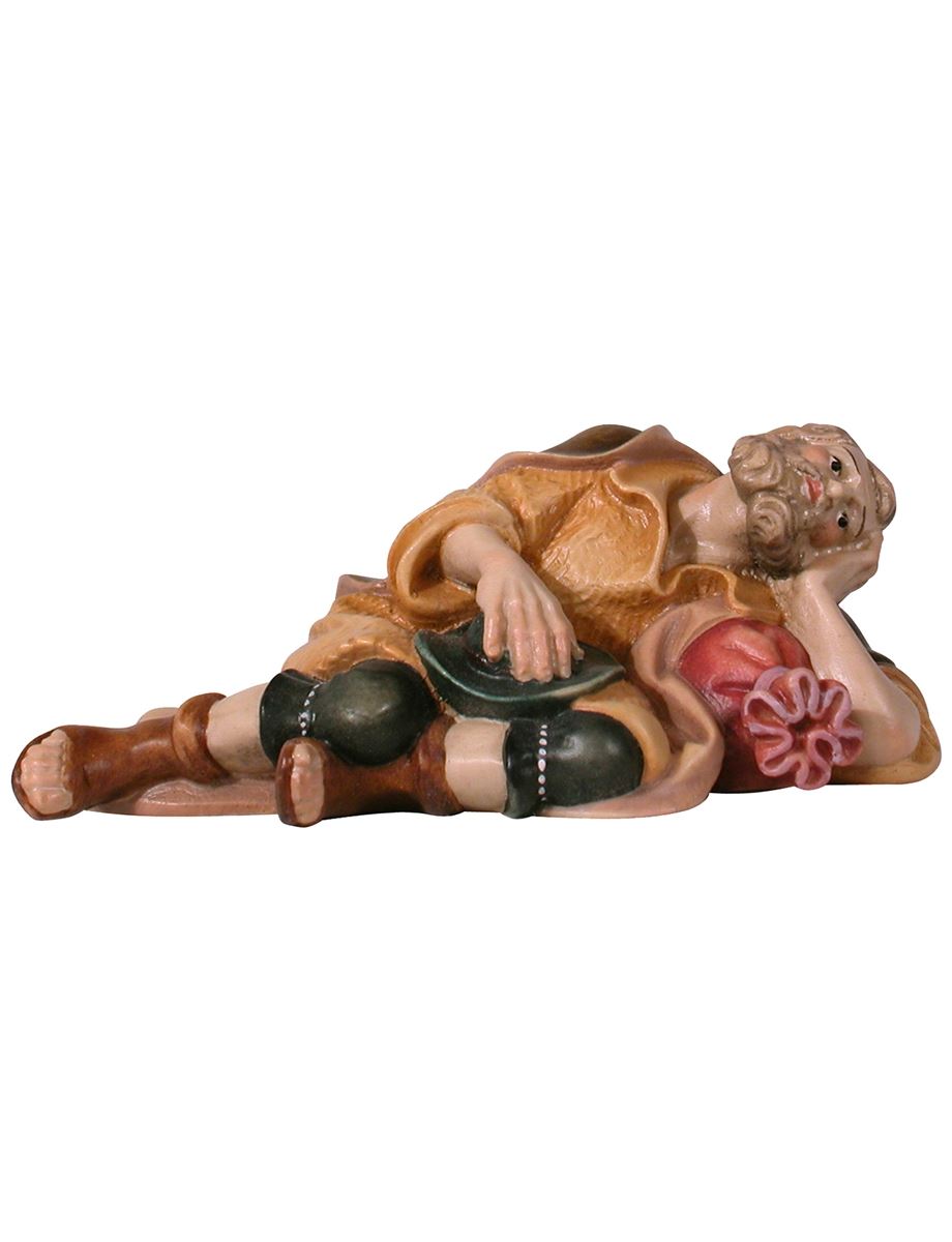 Krippenfigur Hirt liegend der Insam Krippe wird aus Bergahorn geschnitzt und in der Oberflächenausführung Color mit Ölfarben handbemalt.