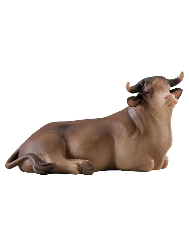 Ochs liegend der Insam Krippe wurde aus Bergahorn geschnitzt und in der Oberflächenausführung Color mit Ölfarben handbemalt. Ochs und Esel waren als erste im Stall, sie bewachen das Christkind und geben die erforderliche Wärme ab.