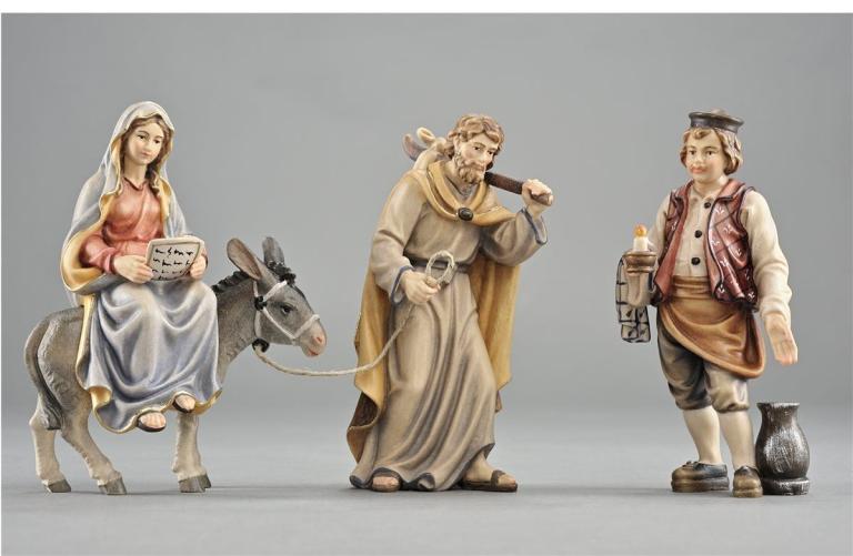 Die Herbersuche der Kostner Krippe ist ein 5 teiliges Set bestehend aus der schwangeren Maria auf Esel reitend und Schrift in der Hand, Josef trägt einen Beutel am Stock befestigt über seinen Schultern und zieht den Esel an der Hand mit Schnur. Der wirklich original getreue Wirt hält einen Blechteller mit Kerze und hat sein Geschirrtuch über den Arm geschlagen. Neben seinem Fuß steht eine kleine Vase welche mit der Figur fest verbunden ist um eine bessere Standhaftigkeit zu geben. Die Krippenfiguren der Herbergsuche mit Wirt der Kostner Krippe aus Ahornholz geschnitzt und in der Ausführung Color mit Ölfarben handbemalt sind vorrätig und kurzfristig lieferbar. Der Hersteller dieser Krippe gewährleistet, dass weitere Figuren dieser Krippe ohne Probleme in den nächsten Jahren nachbestellt werden können.