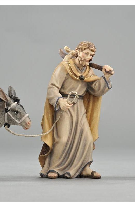 Die Krippenfigur Hl. Josef der Kostner Krippe mit schönen Mantel und viel Faltenwurf hält die Laterne mit Kerze in beiden Händen.