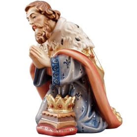 Krippenfigur König kniend der E. Kostner Krippe aus Ahornholz wurde sehr detailreich und liebevoll geschnitzt und in der Ausführung Color mit Ölfarben und Schlagmetallgoldfolie handbemalt. Diese Figur ist lagernd.