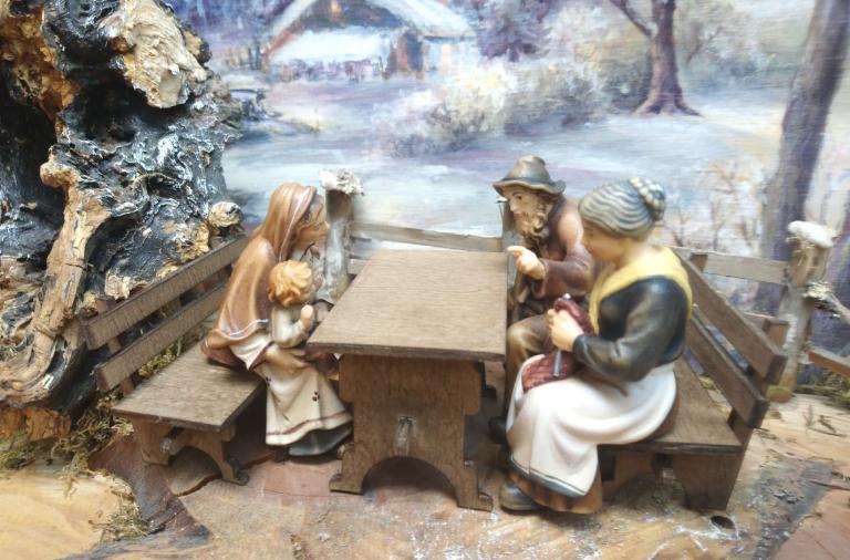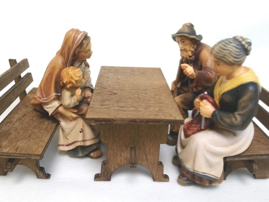 Sehr schöne Krippenszene mit sitzenden Figuren. Bestehend aus Oma strickend, Opa deutend, Frau mit Kind dazu 2 Bänke und ein Tisch im Tiroler Bauernstil. Alternativ könnte man auch Opa mit Pfeife Art. 801-090 dazusetzen.