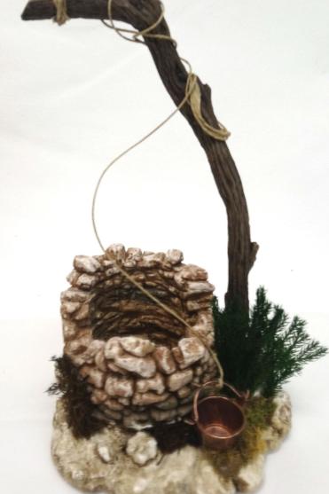Ziehbrunnen mit einem an einem Baumstamm befestigten Kupfereimer zur Bewässerung der Felder und zum tränken der Tiere . Der Brunnenboden ist mit Epoxidharz beschichtet, dies tauscht eine echte Wasseroberfläche vor.