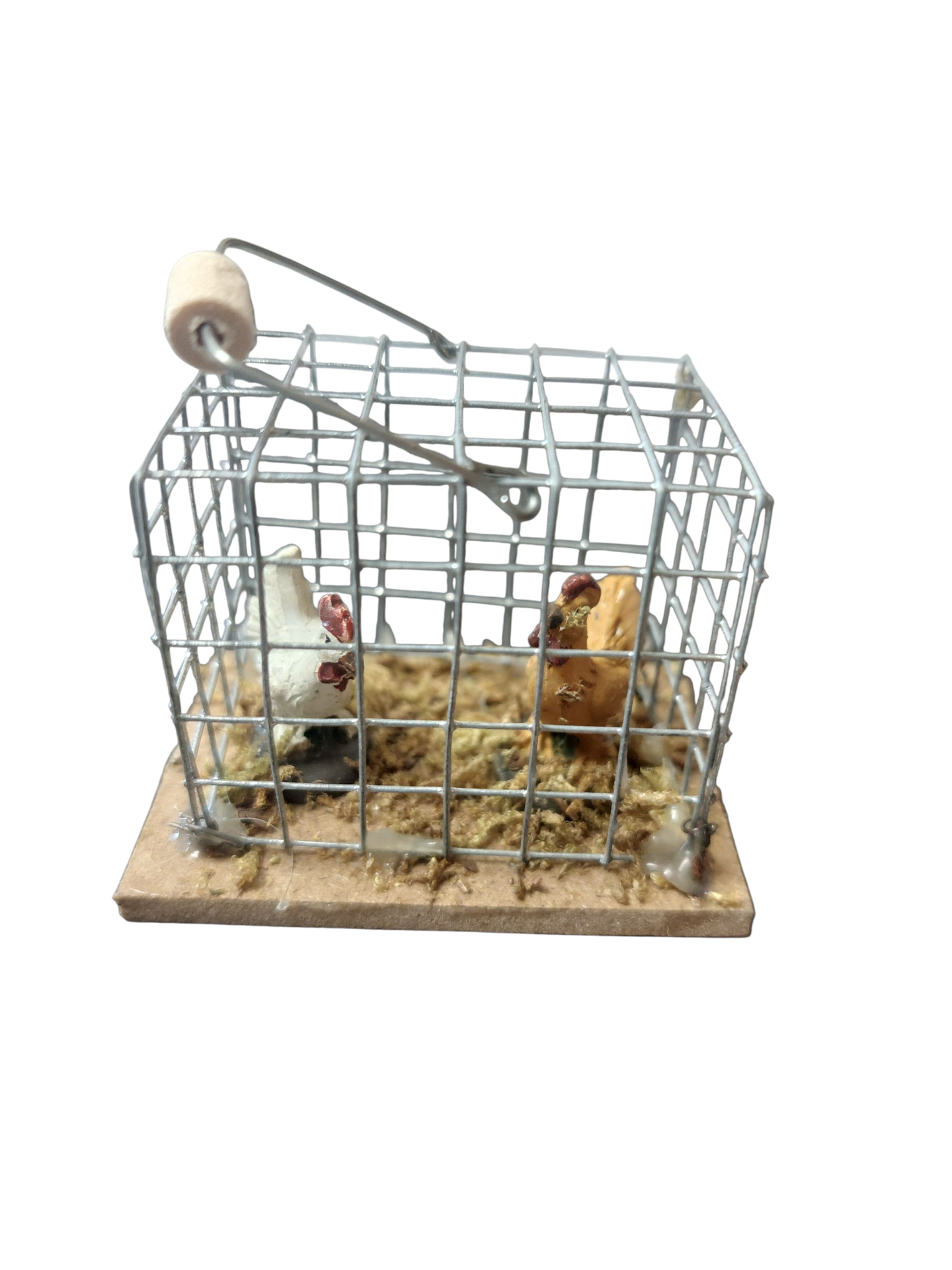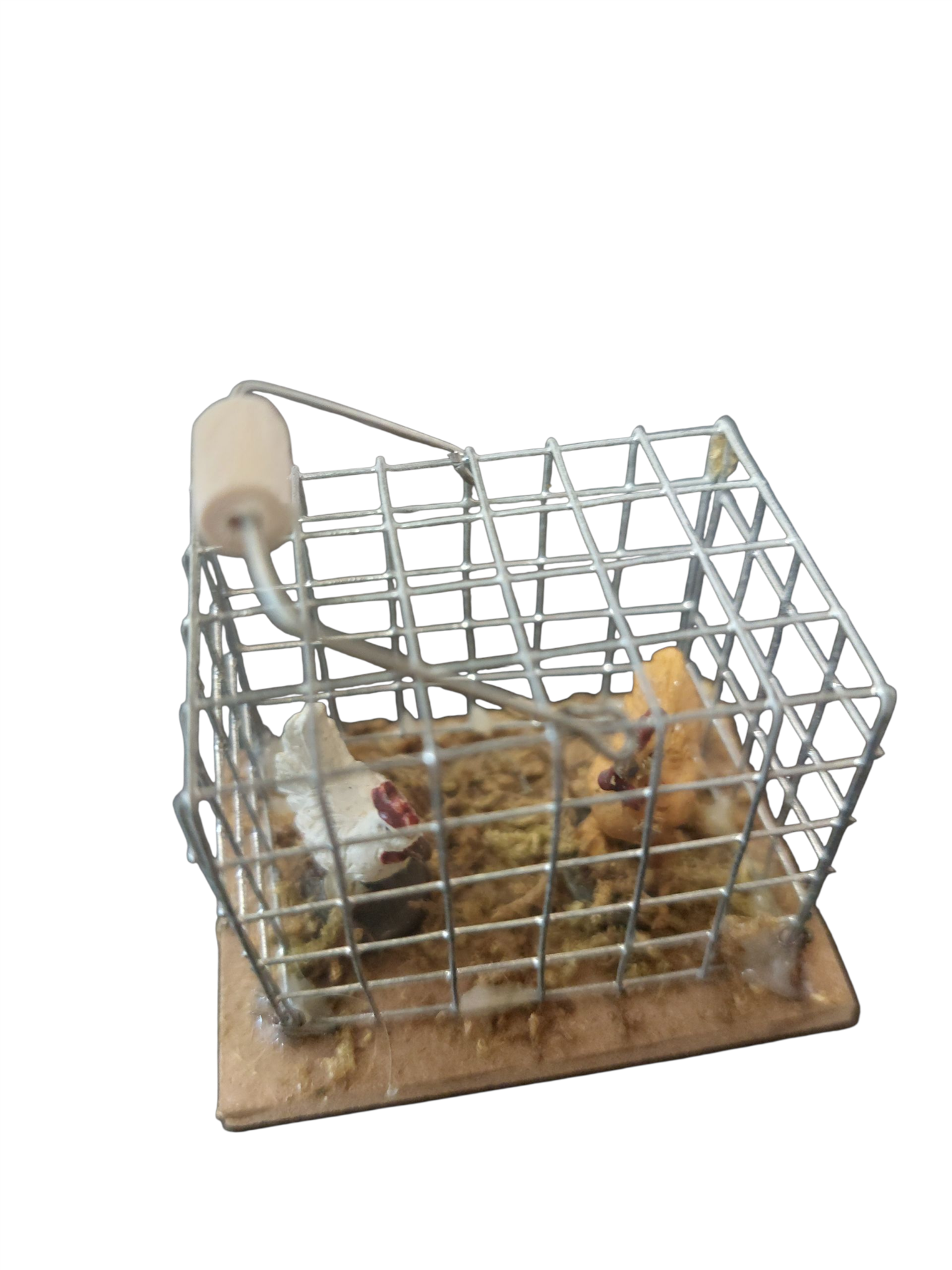 Unser liebevoll gestalteter Metallkäfig mit zwei detailreich gefertigten Hühnern aus Kunststoff misst 3,5 Zentimeter in der Höhe, 4 Zentimeter in der Breite und 3 Zentimeter in der Tiefe. Dieses hochwertige Krippenzubehör fügt sich harmonisch in jede Weihnachtskrippe ein und verleiht Ihren Szenen durch seine realistische Wirkung eine besonders lebendige Atmosphäre. So schaffen Sie mit kleinen, aber feinen Details eine authentische Darstellung traditioneller Handwerkskunst und Heimatverbundenheit.