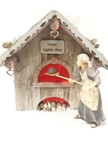 Bäuerin mit Brotschieber Die hübsche Bäuerin hat ihre Haare mit einem bunten Kopftuch bedeckt und trägt eine schön bemalte Schürze zu ihrem weich fallenden, langen Kleid. Mit beiden Händen hält sie den Brotschieber, auf dem sich ein Brotlaib befindet. Zu dieser interessanten Figur passt der Backofen aus der Reihe ideal. Die Figur wurde mit viel Gefühl für die Details in liebevoller Handarbeit aus Bergahorn geschnitzt und mit Ölfarben handbemalt. Ein kleines Metallzertifikat garantiert das Original.