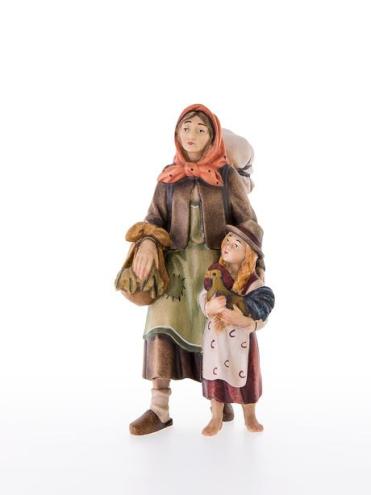 Bäuerin mit Kind „Lass mi a mitgehn“ Die Bäuerin und das Kind sind ein echter Hingucker. Die Bäuerin trägt ein Kopftuch zu ihrem ländlichen Gewand. Auf dem Rücken transportiert sie einen bepackten Korb. In der Hand hält sie ein gebundenes Tuch mit ihren Gaben. Ein Mädchen mit langen blonden Zöpfen begleitet die Frau voller Neugierde und Vorfreude. Es trägt einen neckischen Hut zu seinem Kleid und hält liebevoll ein Huhn in den Armen. Diese schöne Figurenkombi lässt ihre Betrachter schmunzeln. Die Figuren wurden mit viel Gefühl für die Details in liebevoller Handarbeit aus Bergahorn geschnitzt und mit Ölfarben handbemalt. Ein kleines Metallzertifikat garantiert das Original.