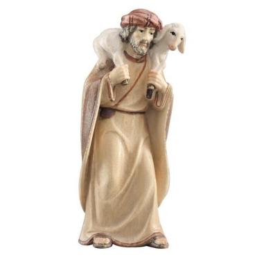 Moderne Krippenfigur Hirt mit Lamm auf Schulter der Advent Krippe in Eschenholz geschnitzt und mit Wasserfarben bemalt