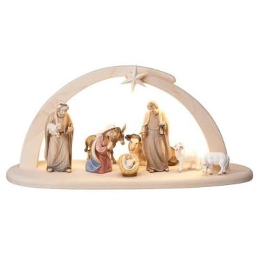 Modernes Set 10 teilig - Stall Leonardo mit Beleuchtung der Advent Krippe in Eschenholz geschnitzt und mit Wasserfarben bemalt