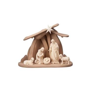 Modernes Set 7 teilig - Familienstall der Advent Krippe in Eschenholz geschnitzt und mit Wasserfarben bemalt
