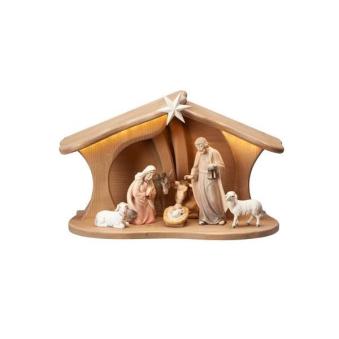 Modernes Set 9 teilig - Familienstall Luce Led der Advent Krippe in Eschenholz geschnitzt und mit Wasserfarben bemalt