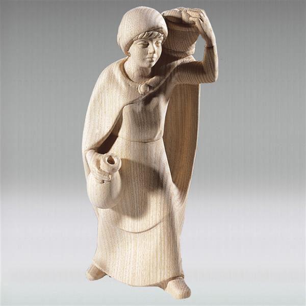 Wasserträgerin der Rowi Krippe in Eschenholz geschnitzt. Diese Figur ist von exquisiter Machart. Sie wirkt schlicht und von der Holzart lebendig und weist aber dennoch viele detailfreudig ausgearbeitete Einzelheiten auf.