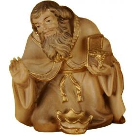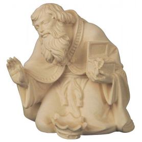 Der kniende König hat seine Krone abgelegt, um das neugeborene Jesuskind anzubeten. Der kniende König hat einen stattlichen Bart und trägt kostbare Kleidung. Er hält eine geöffnete Truhe Gold in den Händen, die er dem Kind überreichen möchte. Die Demut des reichen Mannes ist eine der ergreifendsten Szenen der Bethlehem Krippe