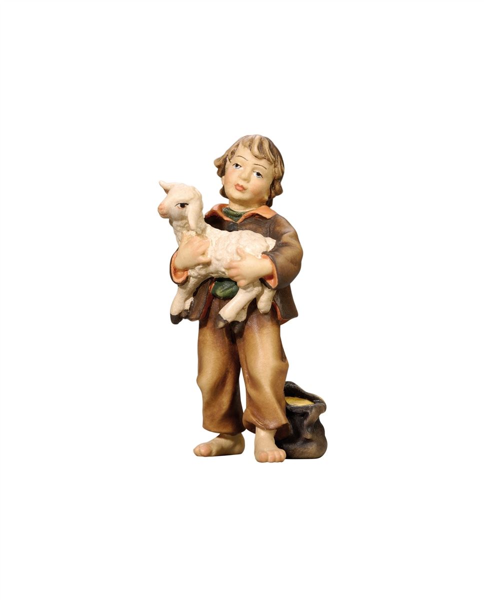 Bub mit Lamm der Simon Krippe wurde aus Bergahorn geschnitzt und in der Oberflächenausführung Color mit Ölfarben handbemalt.