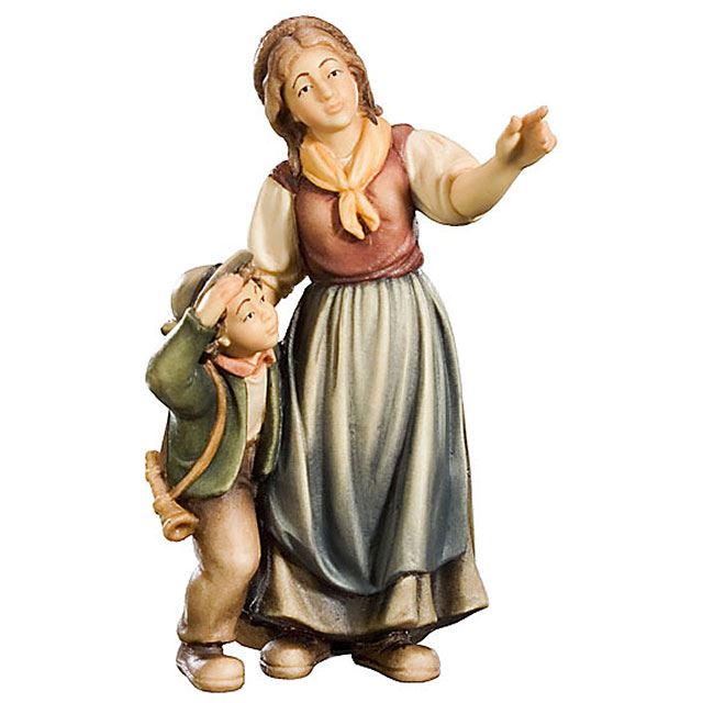 Mit ihrem Finger weist die bäuerliche Frau auf etwas im Himmel hin und der kleine Junge neben ihr hält staunend die Hand über die Stirn. Was mag das wohl sein? Ein Kometstern? Diese Krippenfigur ist ein echter Hingucker in Ihrer Krippe und verleiht Ihrem Szene eine realistische Atmosphäre. Die Frau trägt ein traditionelles bäuerliches Kleid und der Junge ist in warme Kleidung gehüllt.