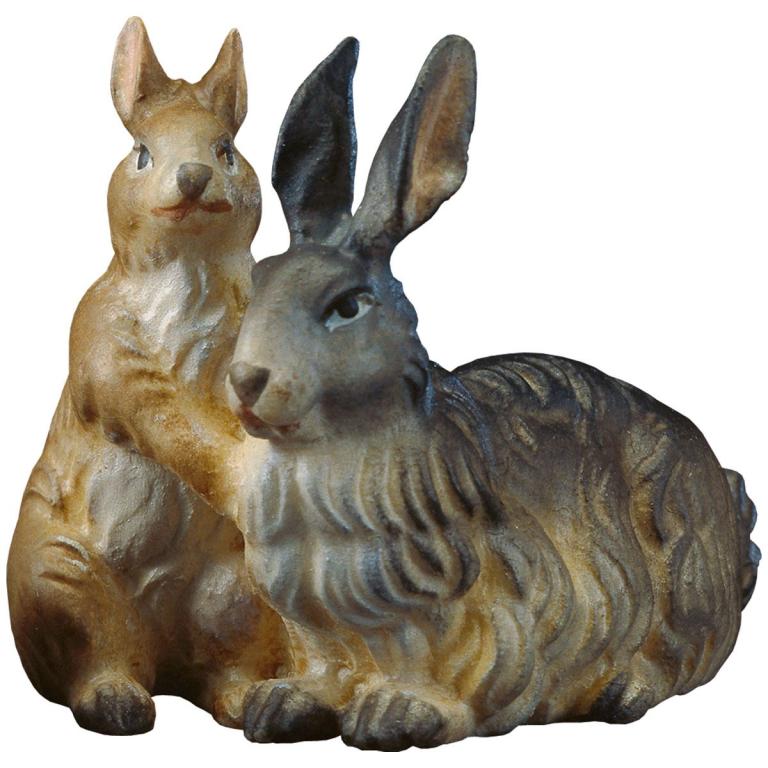 Die Krippenfigur Hasengruppe der Original Ulrich Krippe wurde aus Bergahorn geschnitzt und in der abgebildeten Ausführung color mit Ölfarben handbemalt. Die Figur ist lagernd.
