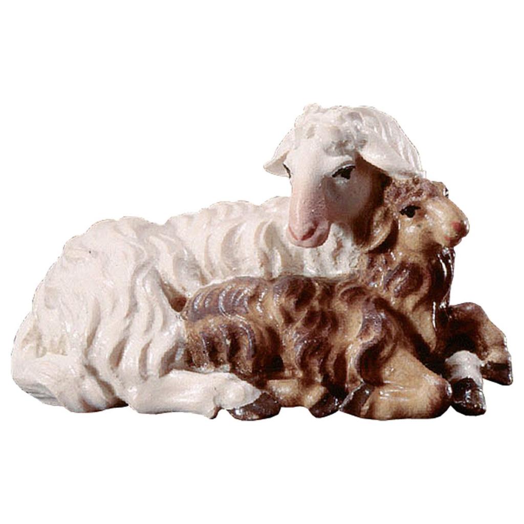 Die Krippenfigur Schaf mit Lamm liegend der Original Ulrich Krippe wurde aus Bergahorn geschnitzt und in der abgebildeten Ausführung color mit Ölfarben handbemalt. Die Figur ist lagernd.