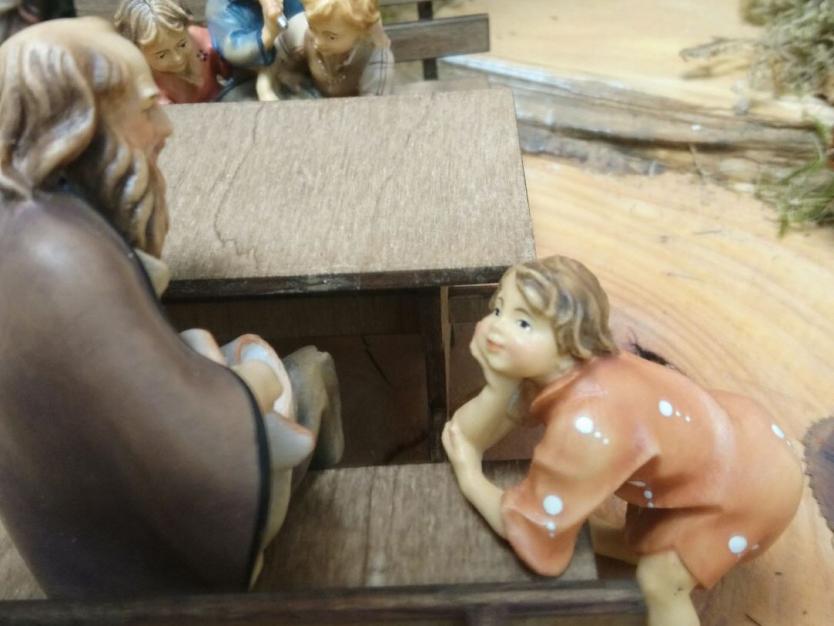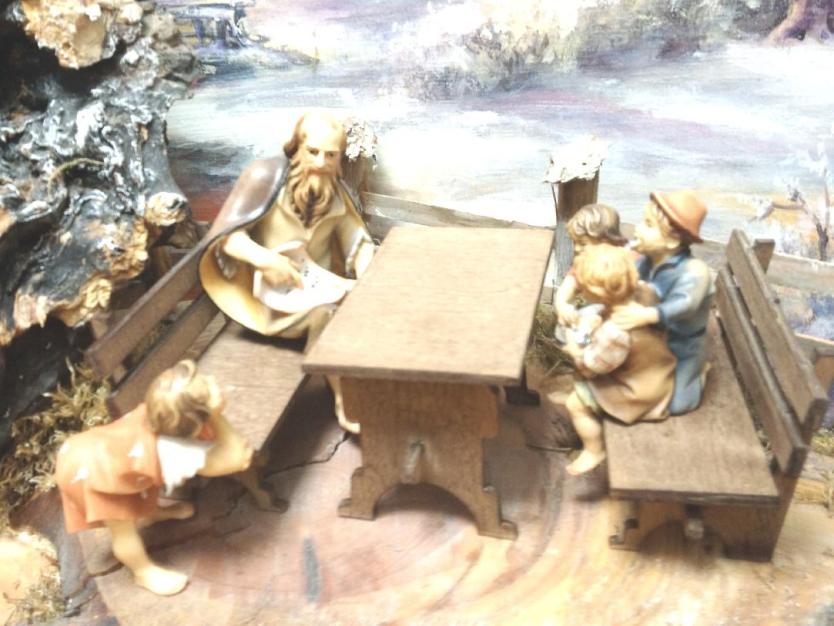 Sehr schönes Krippenset bestehend aus alter Mann erzählend ,Junge zuhörend , Kindergruppe essend und 2 Bänken und einen Tisch im Tiroler Bauernstil